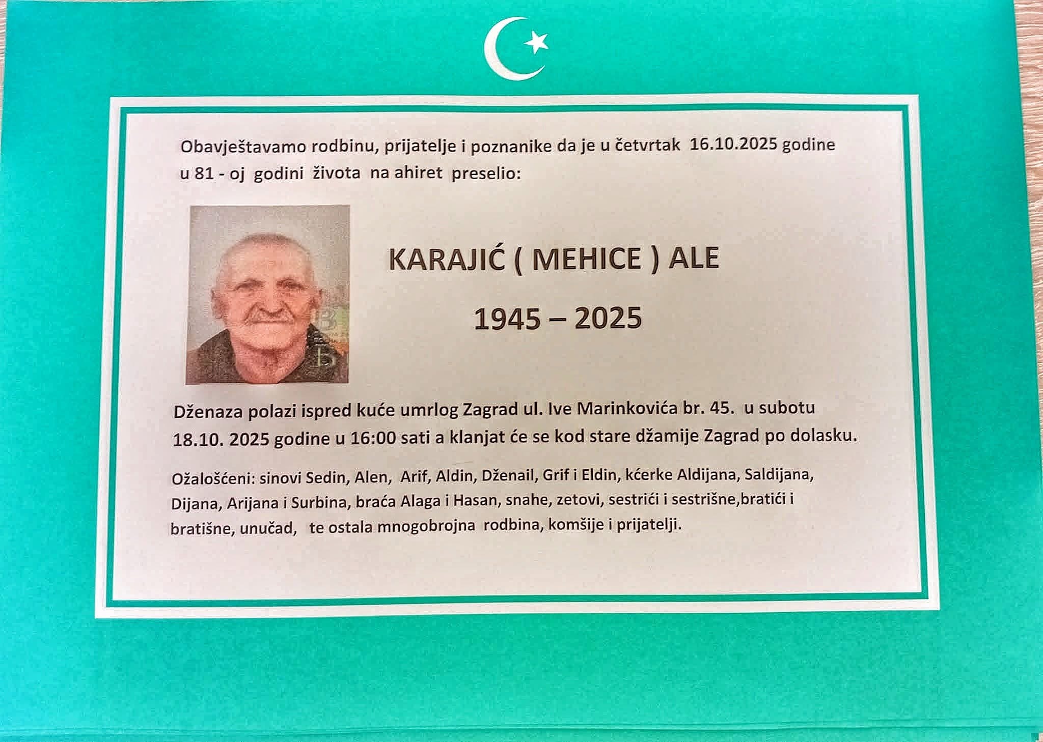 Dženaza polazi ispred kuće umrlog, Zagrad, ul. Ive Marinkovića br. 45, u subotu, 18.10.2025. godine u 16:00 sati, a klanjat će se kod stare džamije Zagrad po dolasku.