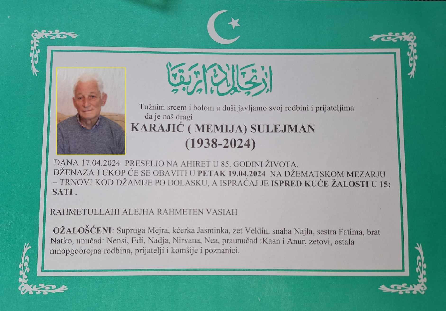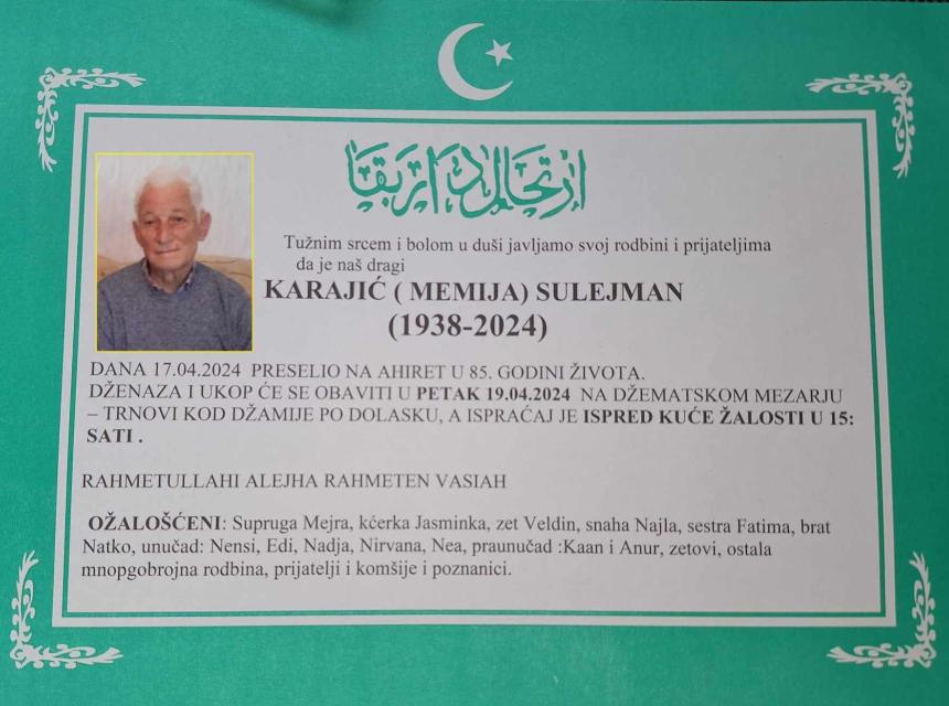 Obavještavamo rodbinu, prijatelje, poznanike i komšije da je dana 17.04.2024. god. u 85. godini života na Ahiret preselio naš dragi Karajić (Memija) Sulejman.
