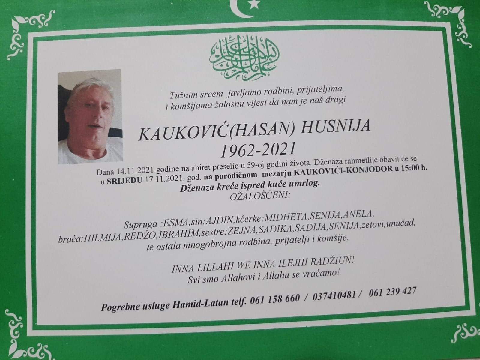 Tužnog srca i s bolom u duši obavještavamo rodbinu, komšije i prijatelje da je naš dragi Kauković (Hasan) Husnija dana 14.11.2021. u 59. godini života preselio na ahiret.