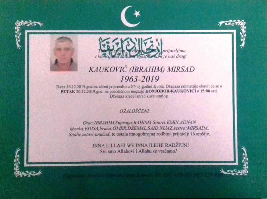Tužnim srcem obavještavamo rodbinu, prijatelje i poznanike da je naš dragi Kauković (Ibrahim) Mirsad dana 16.12.2019. godine u 57-oj godini života preselio na Ahiret.