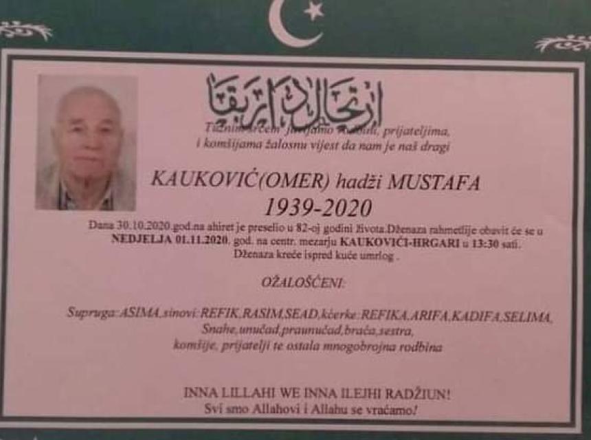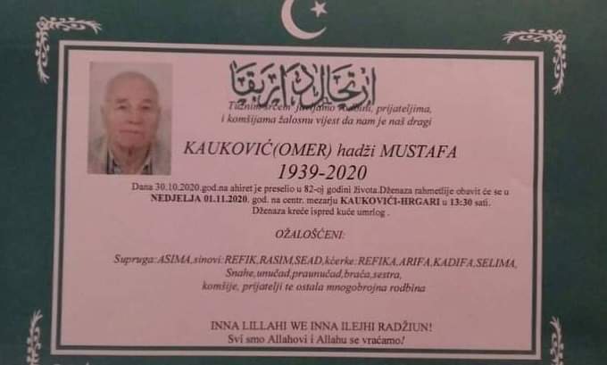 Teškim srcem i bolom u duši javljamo da je naš dragi i nikad prežaljeni Kauković (Omer) hadži Muszafa , dana 30.10.2020.godine u 82-oj godini života preselio na Ahiret.