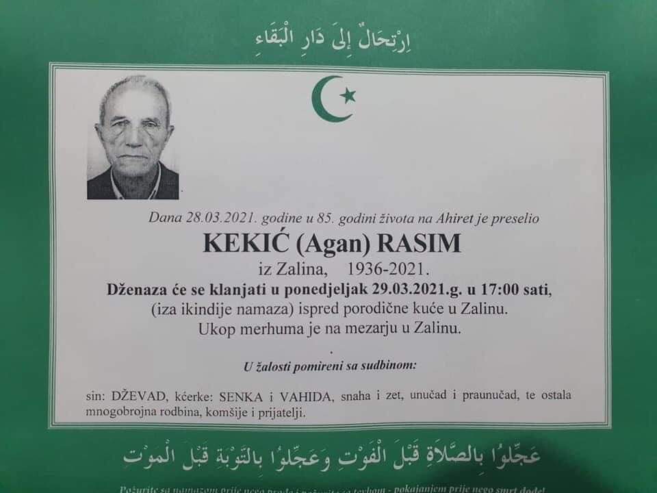 Tužnog srca i s bolom u duši obavještavamo rodbinu, komšije i prijatelje da je naš dragi Kekić (Agan) Rasim, dana 28.03.2021 godine, u 85-oj godini života, preselio na Ahiret.
