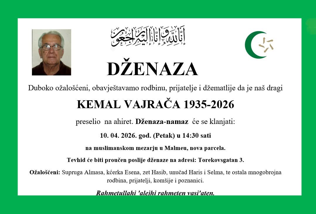 preselio na ahiret. Dženaza-namaz će se klanjati: 10. 04. 2026. god. (petak) u 14:30 sati na muslimanskom mezarju u Malmeu, nova parcela.