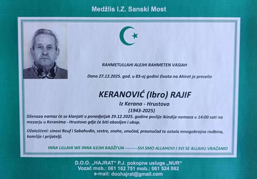 Dženaza namaz će se klanjati u ponedjeljak 29.12.2025. godine poslije ikindije namaza u 14:00 sati na mezarju u Keranima – Hrustovo, gdje će biti obavljen i ukop.