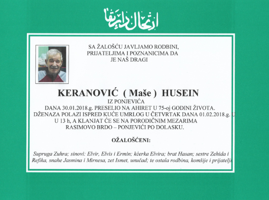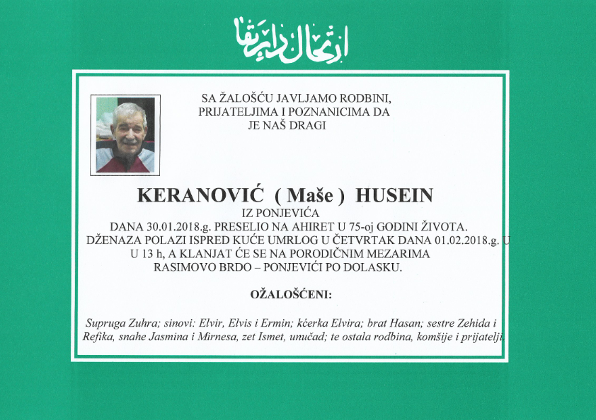 Sa žalošću javljamo rodbini, prijateljima i poznanicima da je naš dragi Keranović (Maše) Husein iz Ponjevića dana 30.01.2018. godine preselio na Ahiret u 75-oj godini života.