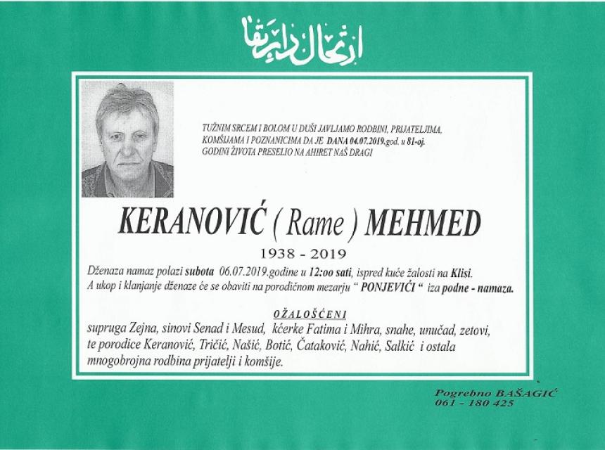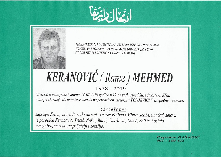 Tužnim srcem javljamo rodbini, prijateljima, komšijama i poznanicima da je dana 04.07.2019. godine u 81.godini života na Ahiret preselio naš dragi Keranović (Rame) Mehmed.