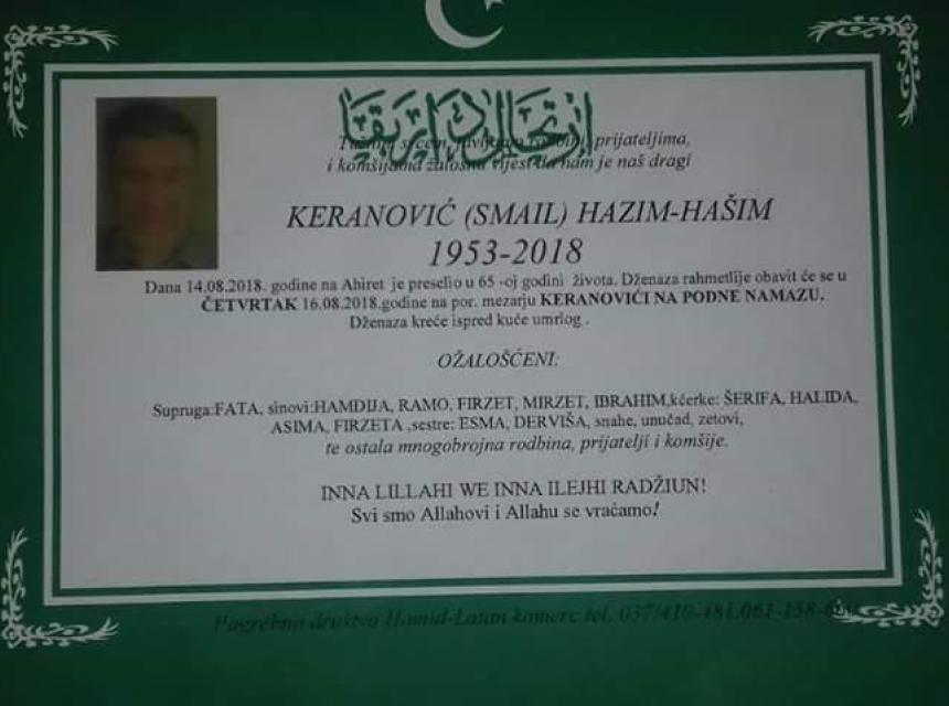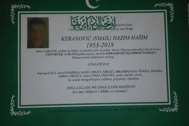 Tužnim srcem i bolom u duši javljamo rodbini, prijateljima, komšijama i poznanicima da je dana 14.08.2018 u 65-oj. godini života na Ahiret preselio Keranović (Smail) Hazim - Hašim.