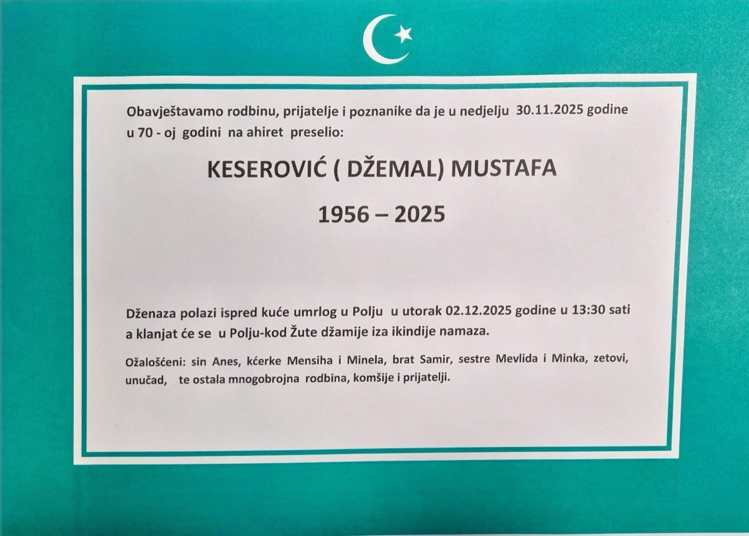 Dženaza polazi ispred kuće umrlog u Polju u utorak 02.12.2025. godine u 13:30 sati,