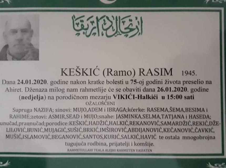 Tužnim srcem i bolom u duši javljamo rodbini i prijateljima da je naš dragi Keškić (Ramo) Rasim u 75. godini života preselio na Ahiret dana 24.01.2020. godine.