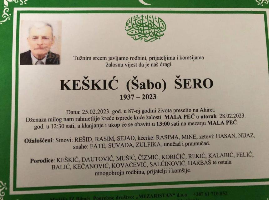 Dana 25.02.2023 godine u 87-oj godini života je na Ahiret preselio Keškić (Šabo) Šero
