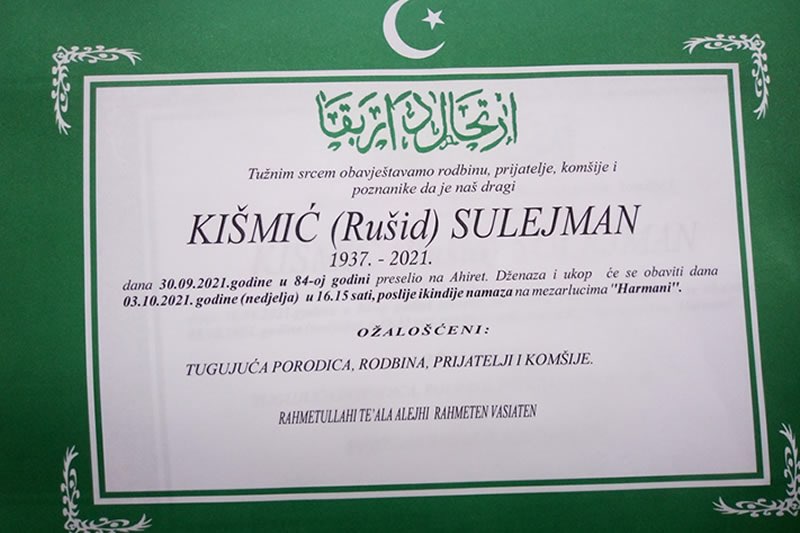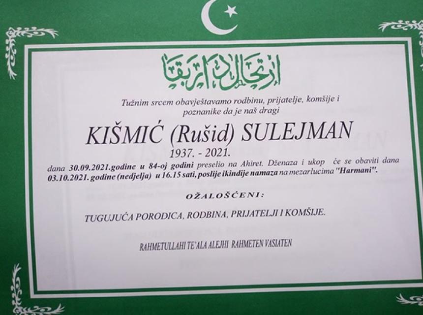 Tužnog srca i s bolom u duši obavještavamo rodbinu, komšije i prijatelje da je naš dragi Kišmić (Rušid) Sulejman, dana 30.09.2021 godine, u 84-oj godini života, preselio na Ahiret.