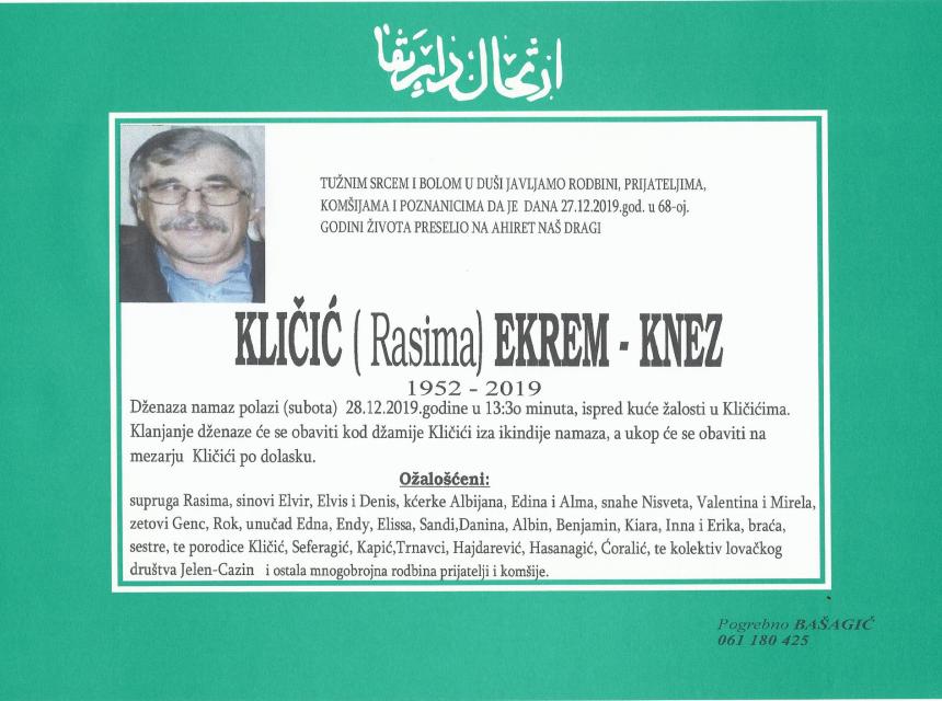 Tužnim srcem i s bolom u duši javljamo rodbini, prijateljima i komšijama da je 27.12.2019. godine u 68. godini života, na Ahiret preselio Kličić ( Rasima ) Ekrem - Knez.