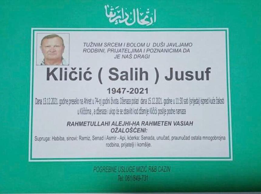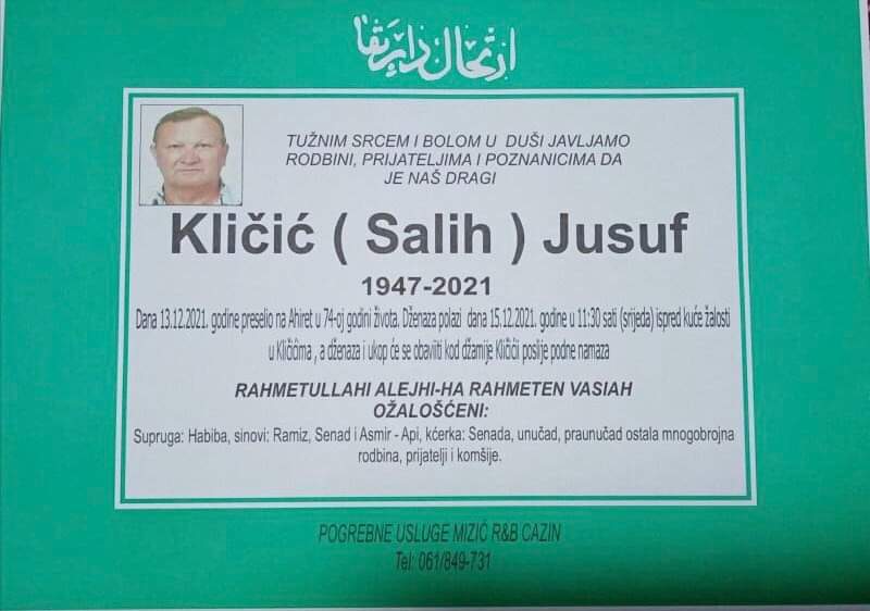 Tužnog srca i s bolom u duši obavještavamo rodbinu, komšije i prijatelje da je naš dragi Kličić (Salih) Jusuf dana 13.12.2021. u 74. godini života preselio na ahiret.