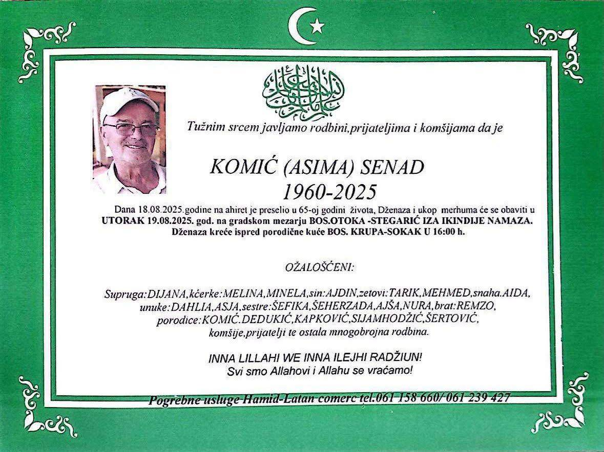 Dženaza i ukop milog nam rahmetlije obavit će se dana 19.08.2025. godine (utorak) na mezaru Bos. Otoka Stegarić poslije ikindije namaza.