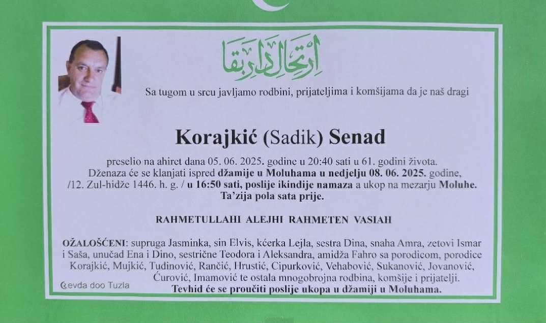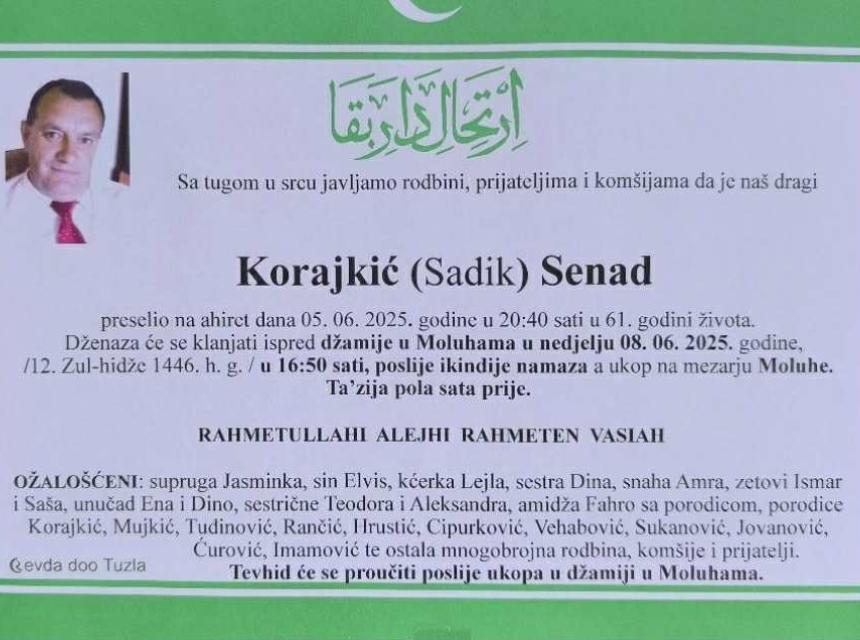 Sa tugom u srcu javljamo rodbini, prijateljima i komšijama da je naš dragi Korajkić (Sadik) Senad preselio na Ahiret dana 05. 06. 2025. godine u 20:40 sati u 61. godini života.