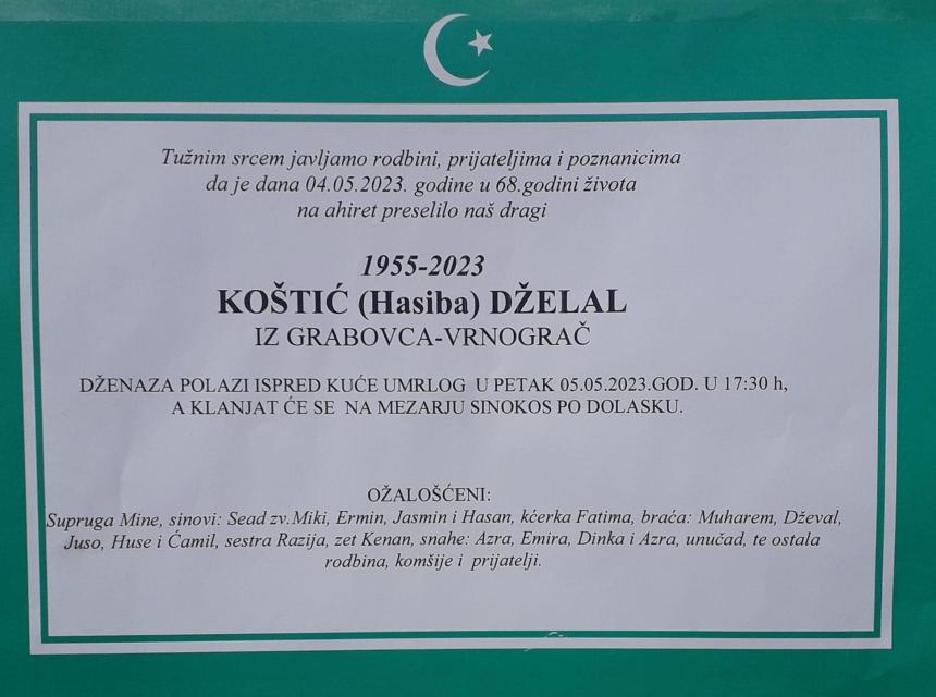 Obavještavamo rodbinu, prijatelje i komšije da je dana 04.05.2023. godine u 68-oj godini života na Ahiret preselio Koštić (Hasiba) Dželal.