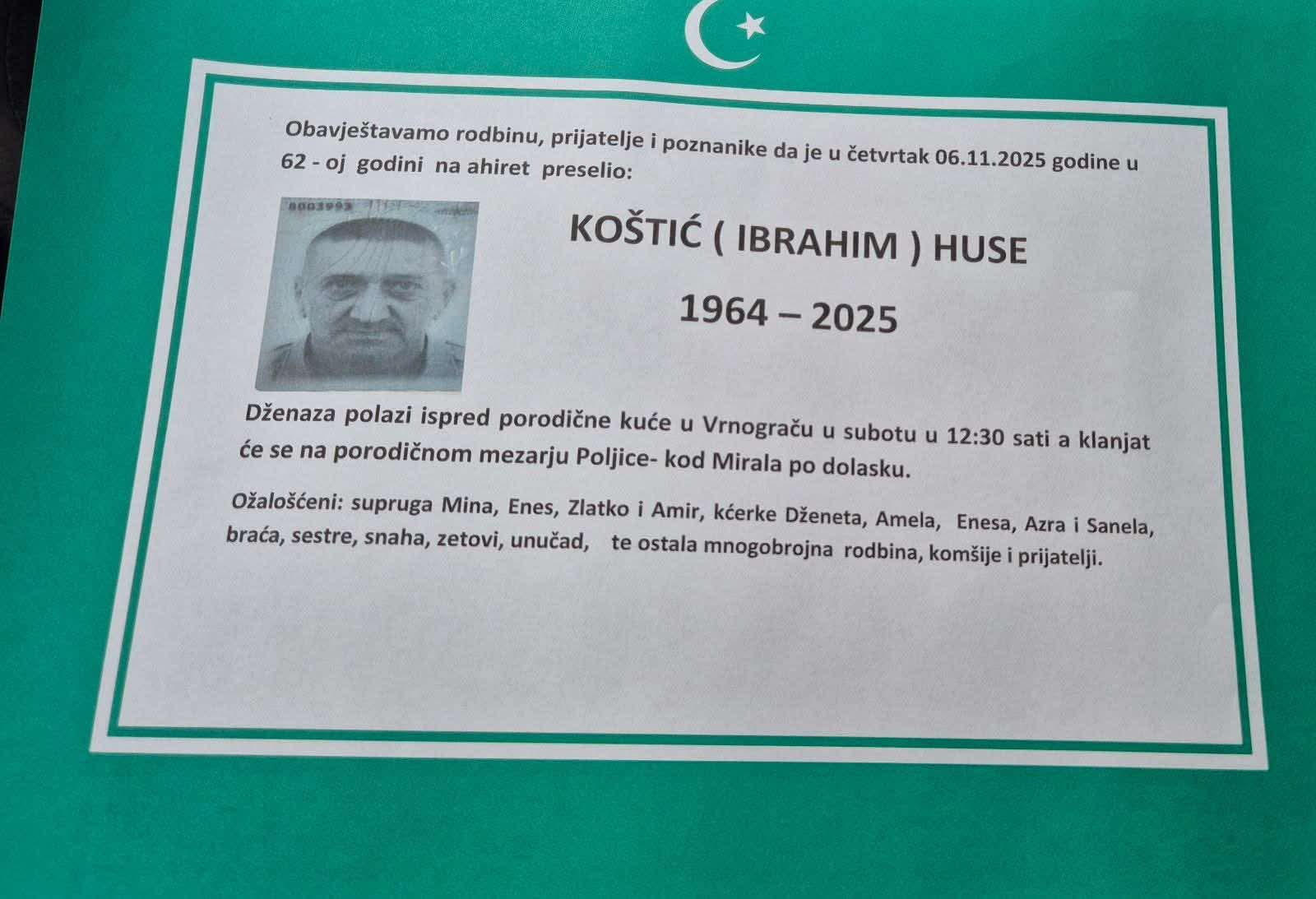 Obavještavamo rodbinu, prijatelje i poznanike da je u četvrtak 06.11.2025. godine u 62-oj godini na ahiret preselio: