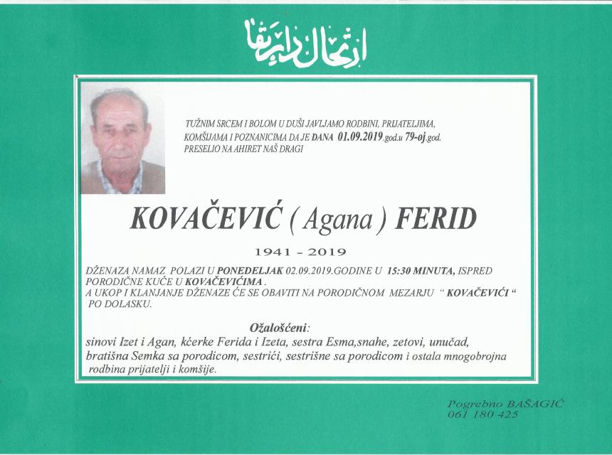 Tužnim srcem i bolom u duši javljamo rodbini, prijateljima, komšijama i poznanicima da je dana 01.09.2019.god. u 79.-oj godini života preselio na Ahiret naš dragi Kovačević (Agana) Ferid.