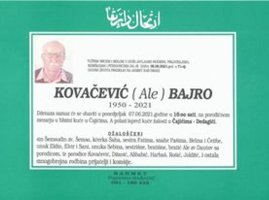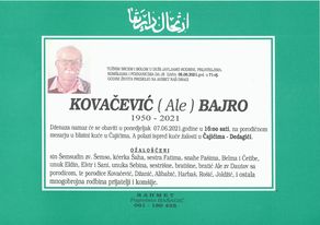 Tužnog srca i s bolom u duši obavještavamo rodbinu, komšije i prijatelje da je naš dragi Kovačević (Ale) Bajro, dana 05.06.2021 godine, u 71-oj godini života, preselio na Ahiret.