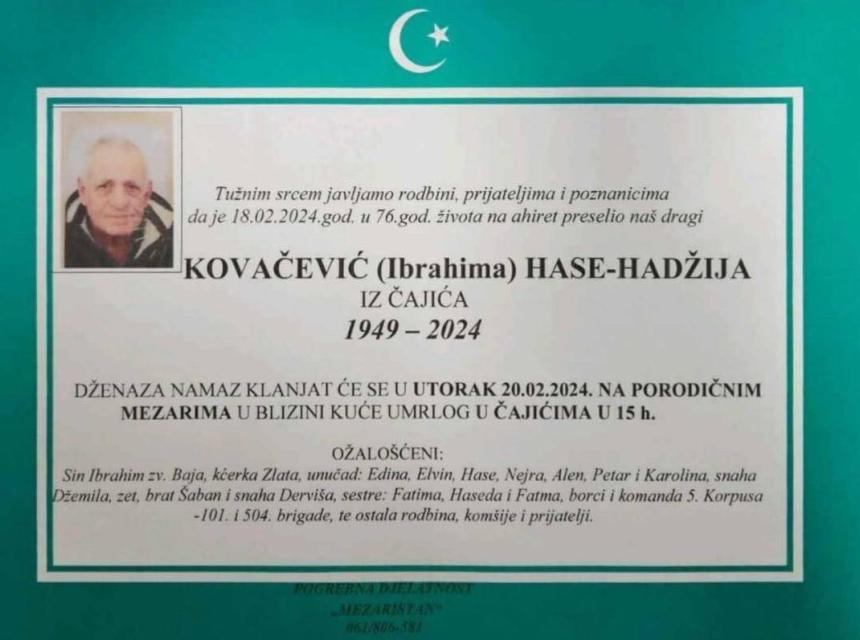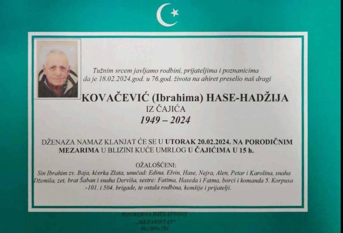Obavještavamo rodbinu, prijatelje i komšije da je naš dragi Kovačević (Ibrahima) Hase-Hadžija dana 18.02.2024. godine u 76-oj godini života preselio na Ahiret.