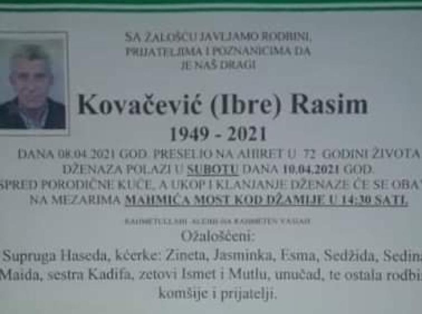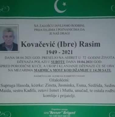 Tužnog srca i s bolom u duši obavještavamo rodbinu, komšije i prijatelje da je naš dragi Kovačević (Ibre) Rasim 08.04.2021. godine, u 72. godini života preselio na ahiret.