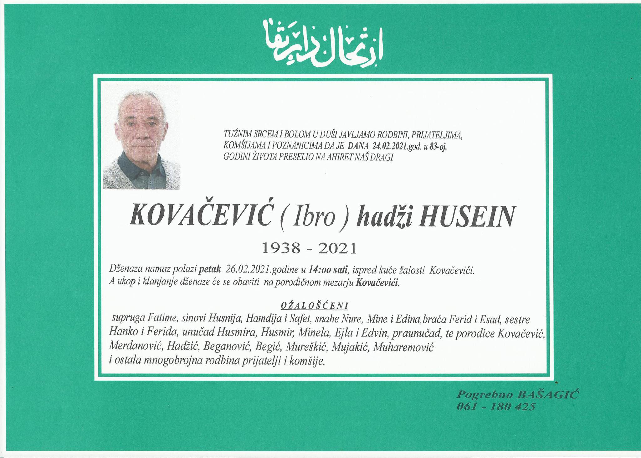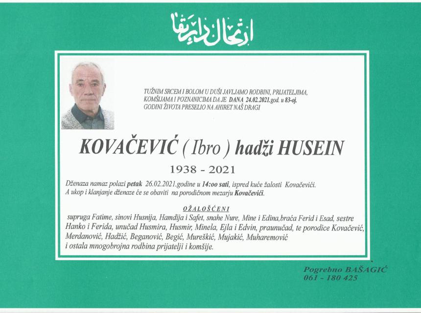 Tužnog srca i s bolom u duši obavještavamo rodbinu, komšije i prijatelje da je naš dragi Kovačević (Ibro) hadži Husein 24.02.2021. godine, u 83. godini života preselio na Ahiret.
