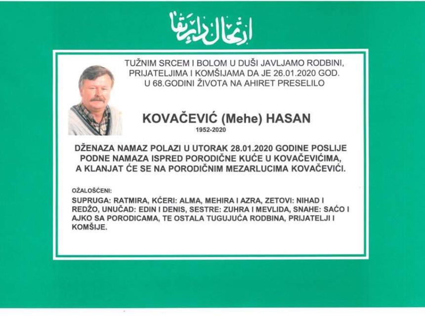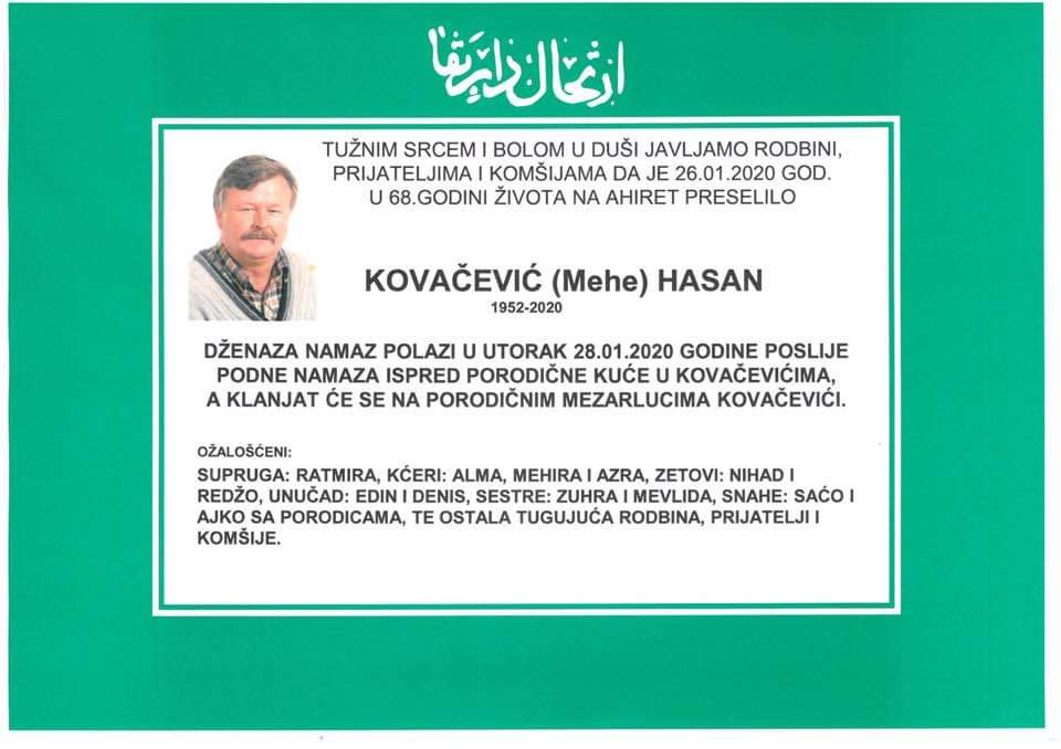 Tužnim srcem i bolom u duši javljamo rodbini i prijateljima da je dana 26.01.2020. godine u 68-oj godini života, na Ahiret preselio Kovačević (Mehe) Hasan.