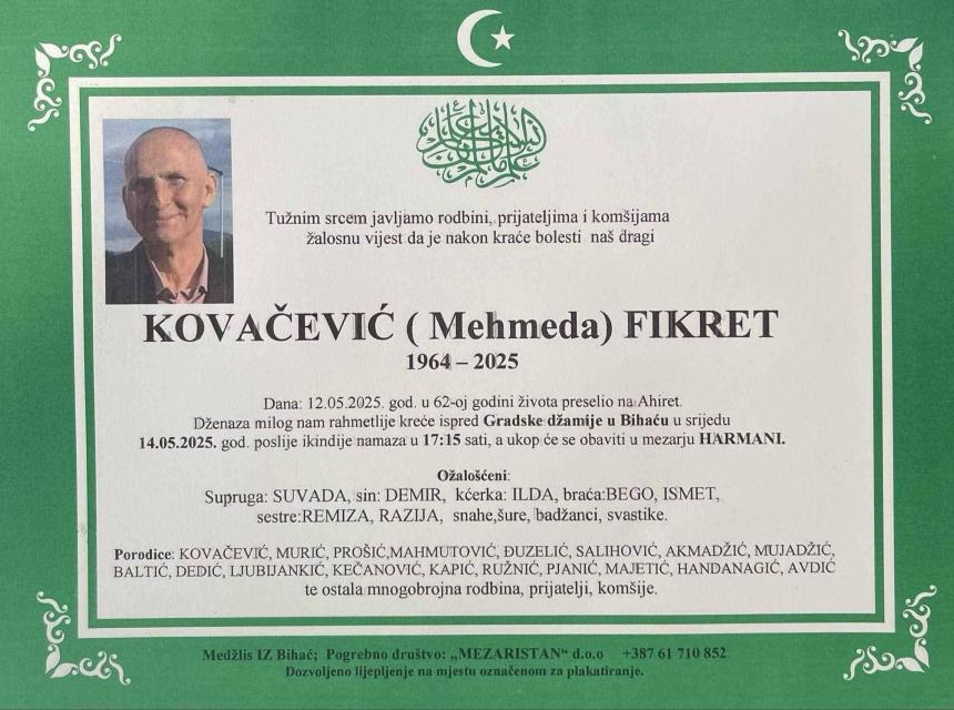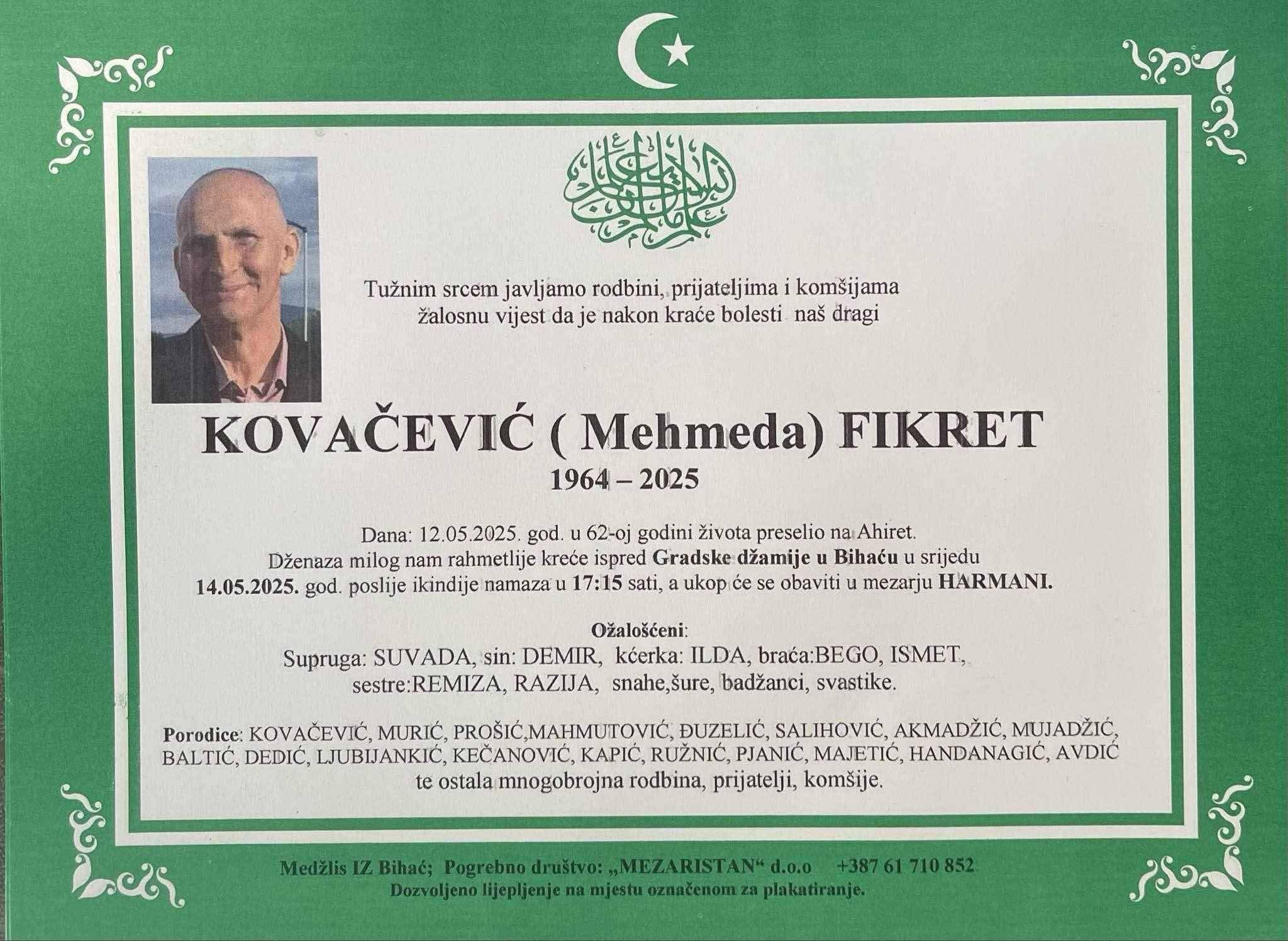 Tužnim srcem i bolom u duši javljamo rodbini, prijateljima i komšijama da je naš dragi Kovačević (Mehmeda) Fikret, dana 12.05.2025. godine u 62-oj godini života, preselio na Ahiret.