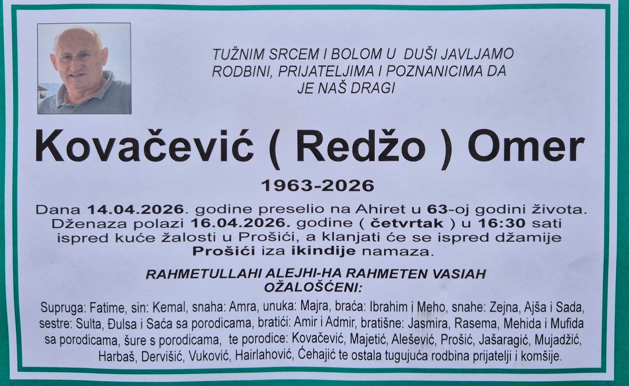 Dženaza polazi 16.04.2026. godine (četvrtak) u 16:30 sati ispred kuće žalosti u Prošićima, a klanjat će se ispred džamije u Prošićima iza ikindije namaza.