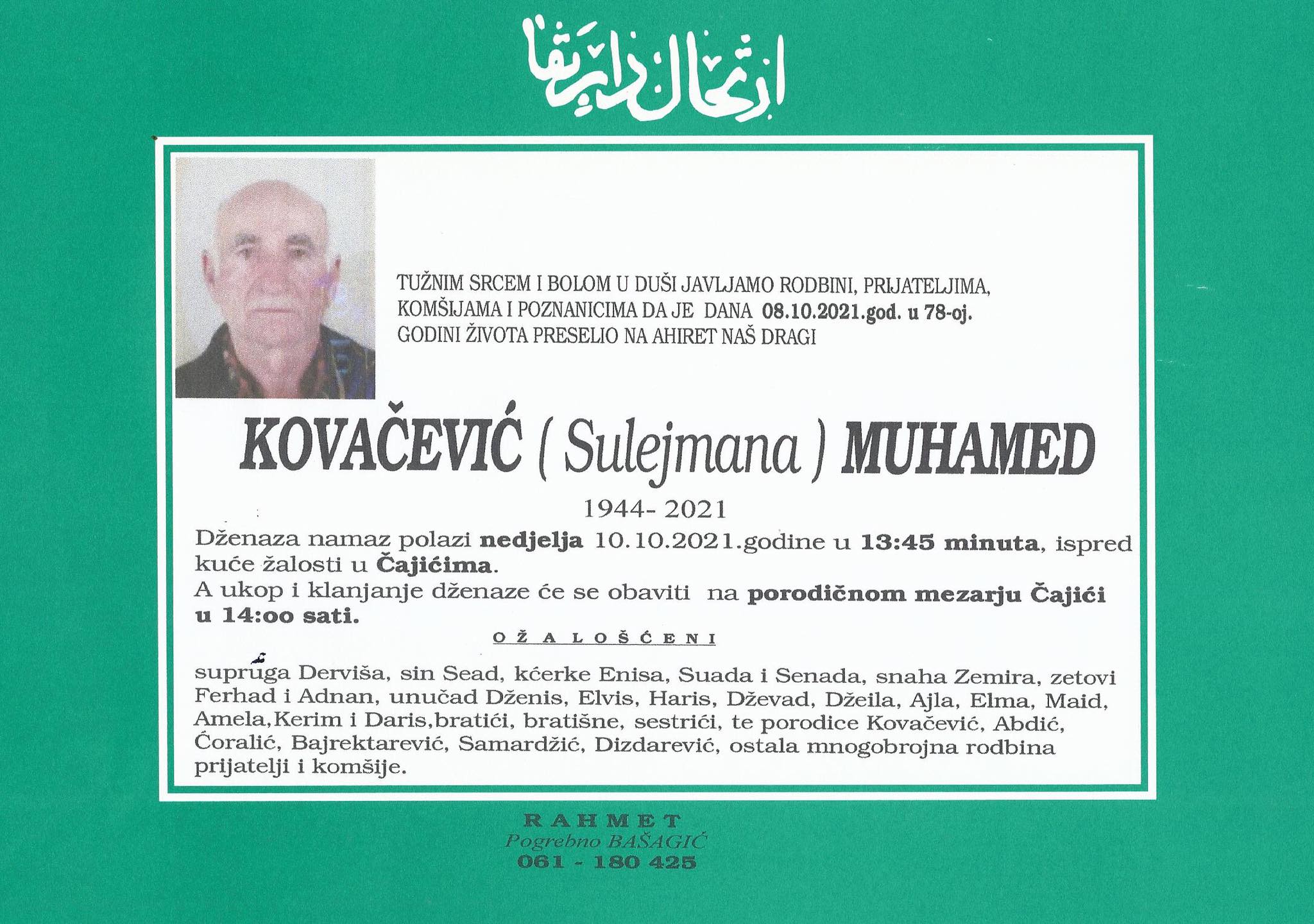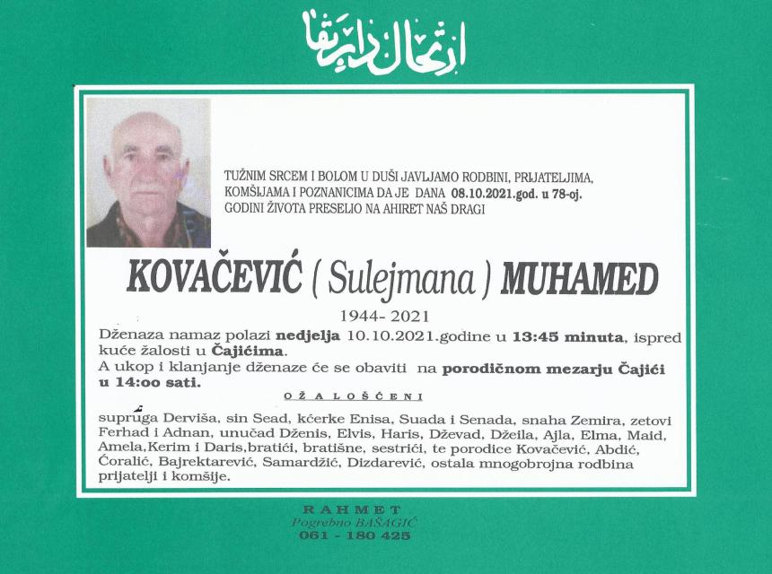 Tužnog srca i s bolom u duši obavještavamo rodbinu, komšije i prijatelje da je naš dragi Kovačević (Sulejmana) Muhamed, dana 08.10.2021. godine, u 78-oj godini života, preselio na Ahiret.