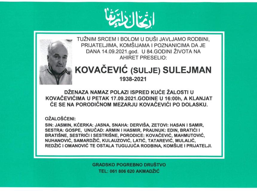 Tužnog srca i s bolom u duši obavještavamo rodbinu, komšije i prijatelje da je naš dragi Kovačević (Sulje) Sulejman, dana 14.09.2021. godine, u 84-oj godini života preselio na ahiret.