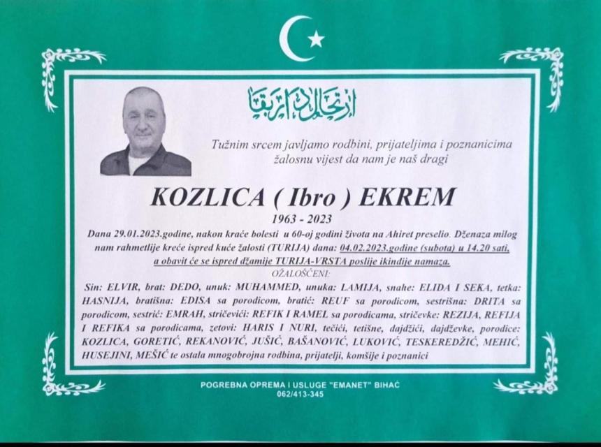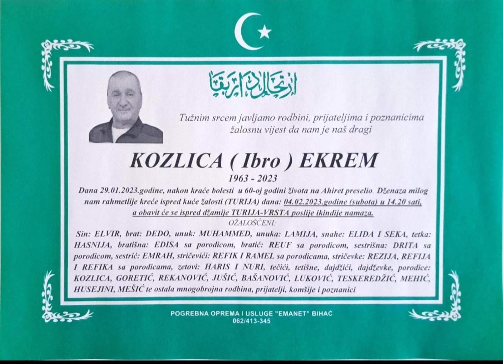 Tužnog srca i s bolom u duši obavještavamo rodbinu, komšije i prijatelje da je naš dragi Kozlica (Ibro) Ekrem u 60-oj godini života, preselio na Ahiret.