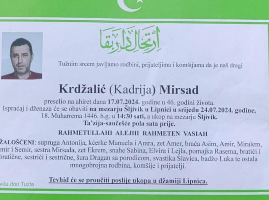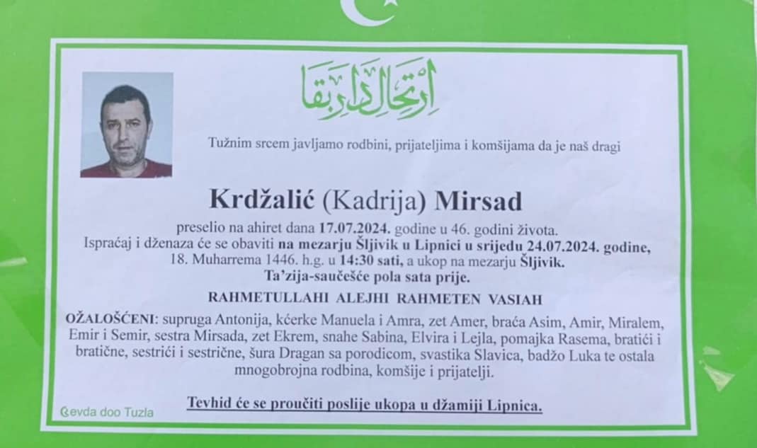 Tužnim srcem i bolom u duši javljamo rodbini, prijateljima i komšijama da je naš dragi Krdžalić (Kadrija) Mirsad, dana 17.07.2024. godine u 46-oj godini života, preselio na Ahiret.
