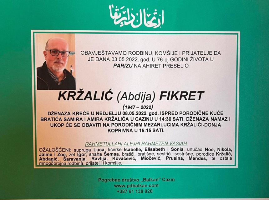Tužnog srca i s bolom u duši obavještavamo rodbinu, komšije i prijatelje da je naš dragi Kržalić (Abdija) Fikret u 76. godini života preselio na Ahiret.