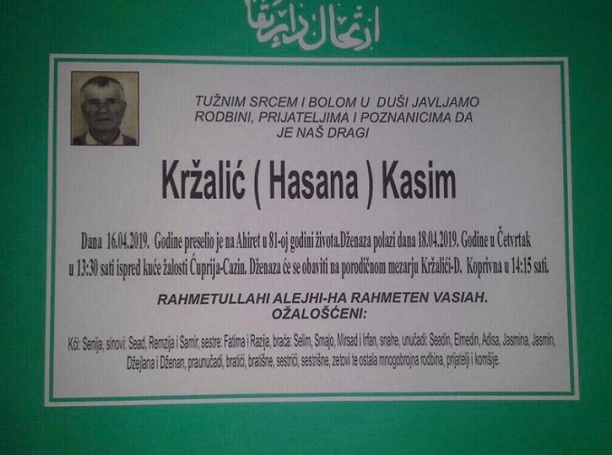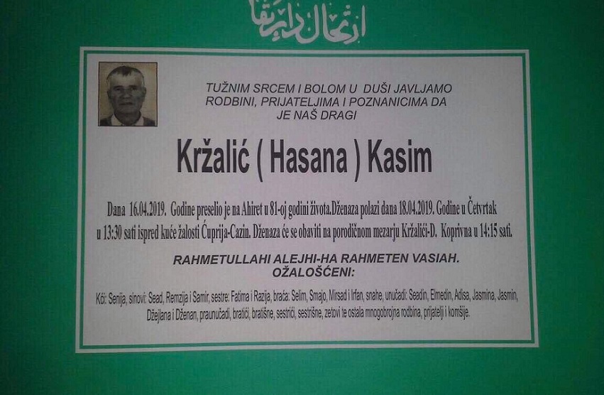 Tužnim srcem i bolom u duši javljamo rodbini, prijateljima, komšijama i poznanicima da je dana 16.04.2019. godine u 81. godini života na Ahiret preselio naš dragi Kržalić (Hasana) Kasim.