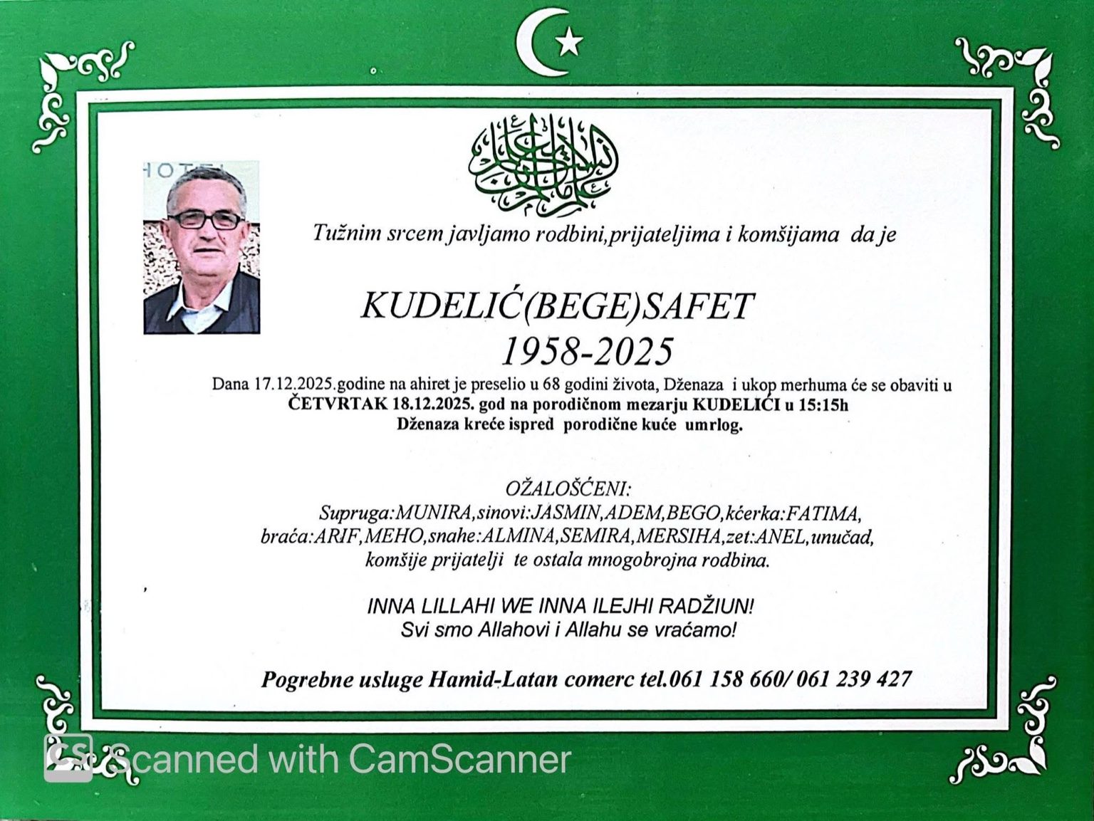 Dženaza i ukop merhuma će se obaviti u četvrtak, 18.12.2025. godine, na porodičnom mezarju Kudelići u 15:15 sati.