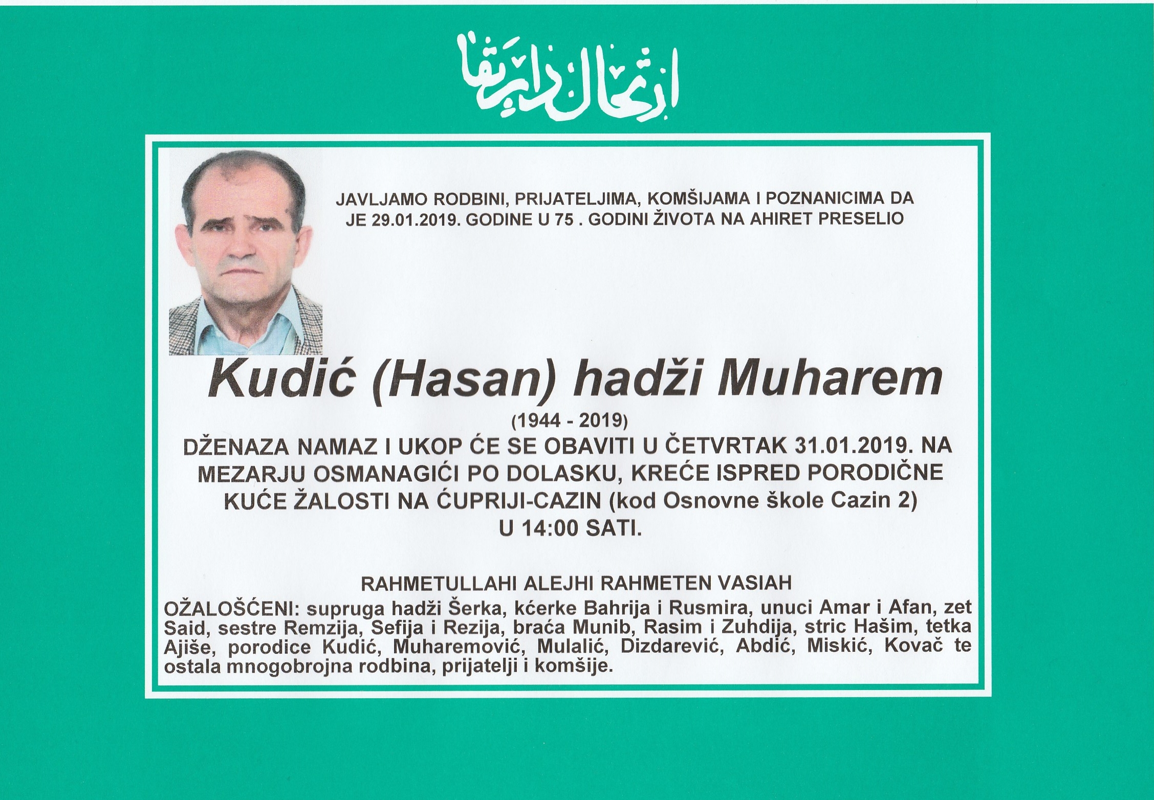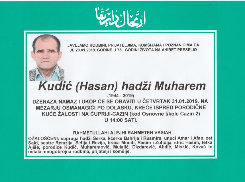 OBAVIJEST O SMRTI 30 Jan, 2019 - 10:09 / Uredio: Ibrahim Š. / 0 Comments Na Ahiret preselio Kudić (Hasan) hadži Muharem Javljamo rodbini, prijateljima, komšijama i poznanicima da je 29.01.2019. godine u 75. godini života na Ahiret preselio Kudić (Hasan) hadži Muharem. Smrtovnica Dženaza Obavijest o smrti Related Articles OBAVIJEST O SMRTI 05 Dec, 2025 Na Ahiret preselila Smlatić (Mulalić) Vahida OBAVIJEST O SMRTI 05 Dec, 2025 Na Ahiret preselila hadži Sebila (Bajraktarević) Ćaušević OBAVIJEST O SMRTI 05 Dec, 2025 Na Ahiret preselila Prasko (Velid) Edina OBAVIJEST O SMRTI 05 Dec, 2025 Na Ahiret preselila Handanagić (rođ. Durić) Esada–Enesa OBAVIJEST O SMRTI 05 Dec, 2025 Na Ahiret preselila Kapić (rođ. Abdić) Fatima OBAVIJEST O SMRTI 05 Dec, 2025 Na Ahiret preselila Nuhanović (Čazima) Sabina