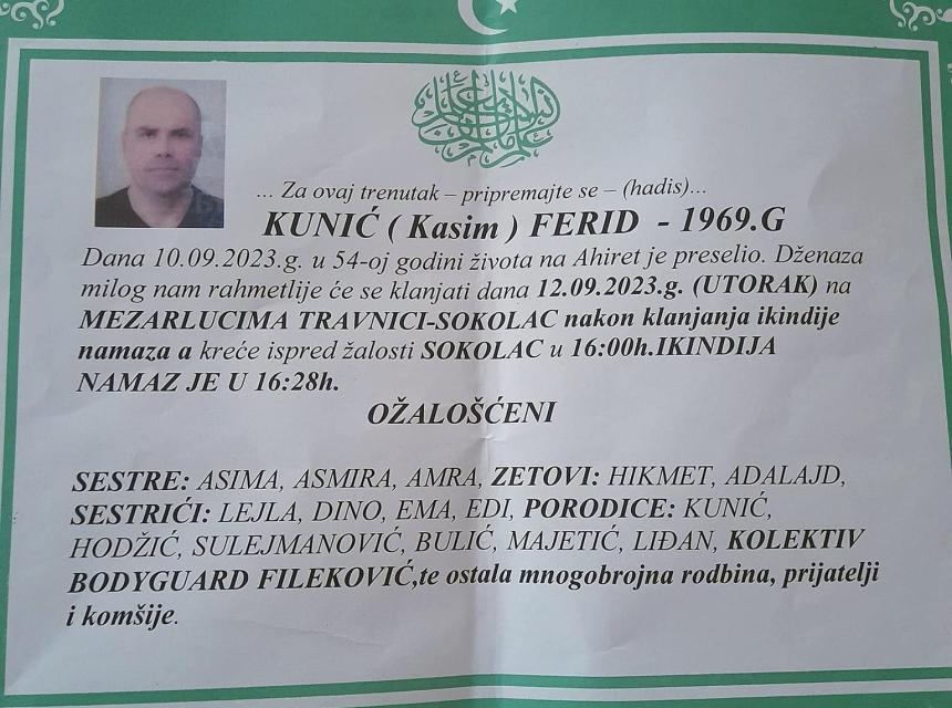Tužnim srcem i bolom u duši obavještavamo rodbinu, prijatelje i komšije da je naš dragi Kunić (Kasim) Ferid, dana 10.09.2023. godine u 54-oj godini života, preselio na Ahiret.
