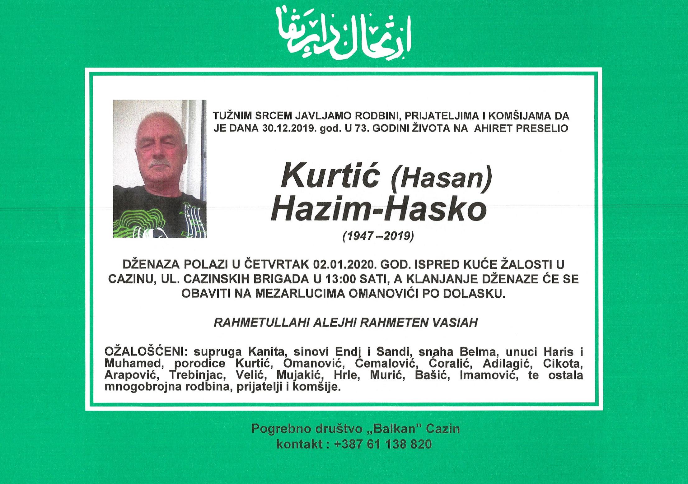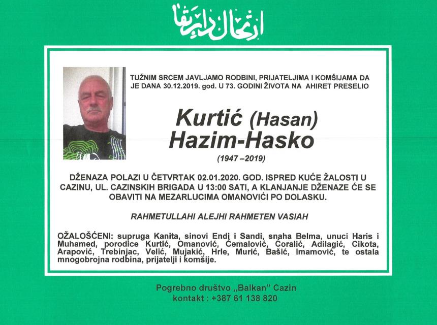 Tužni srcem obaviještavamo rodbinu, prijatelje i poznanike da je naš dragi Kurtić (Hasan) Hazim-Hasko dana 30.12.2019. godine u 73-oj godini života preselio na Ahiret.