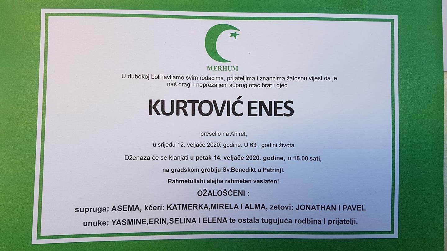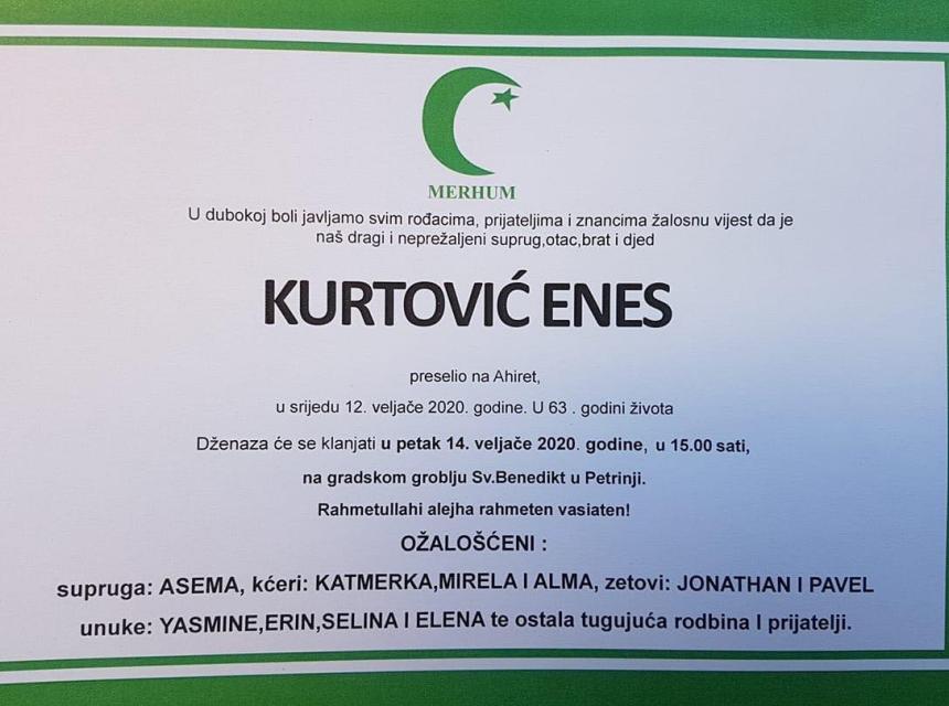 Tužnog srca i s bolom u duši obavještavamo porodicu, komšije i prijatelje da je naš dragi Kurtović Enes, dana 12. februara 2020. godine u 63. godini života, preselio na Ahiret.