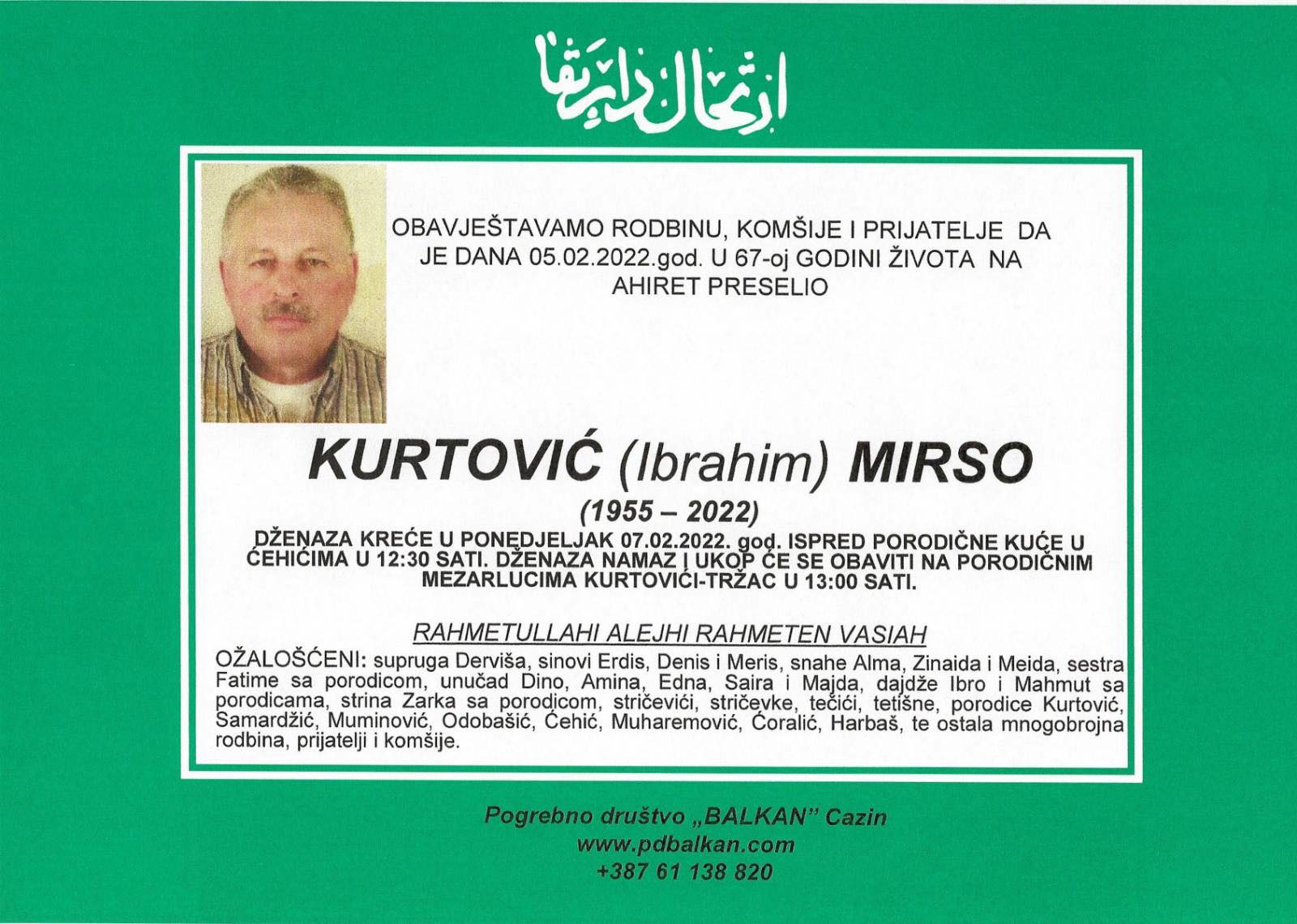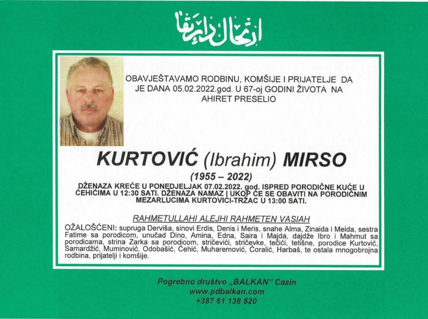 Tužnog srca i s bolom u duši obavještavamo rodbinu, komšije i prijatelje da je naš dragi Kurtović (Ibrahim) Mirso 05.02.2022. u 67. godini života preselio na ahiret.