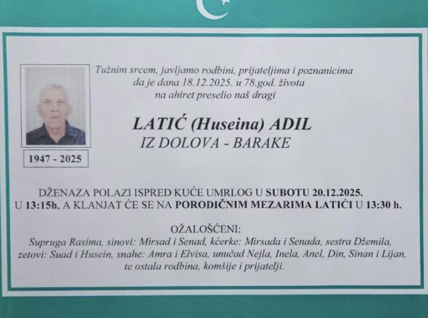 Tužnim srcem javljamo rodbini, prijateljima i poznanicima da je dana 18.12.2025. godine, u 78. godini života, na ahiret preselio naš dragi Latić (Huseina) Adil iz Dolova – Barake.