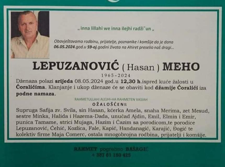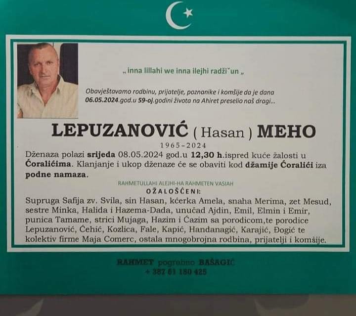 Obavještavamo rodbinu, prijatelje i komšije da je 06.05.2024. godine u 59.oj godini života na ahiret preselio Lepuzanović (Hasan) Meho.