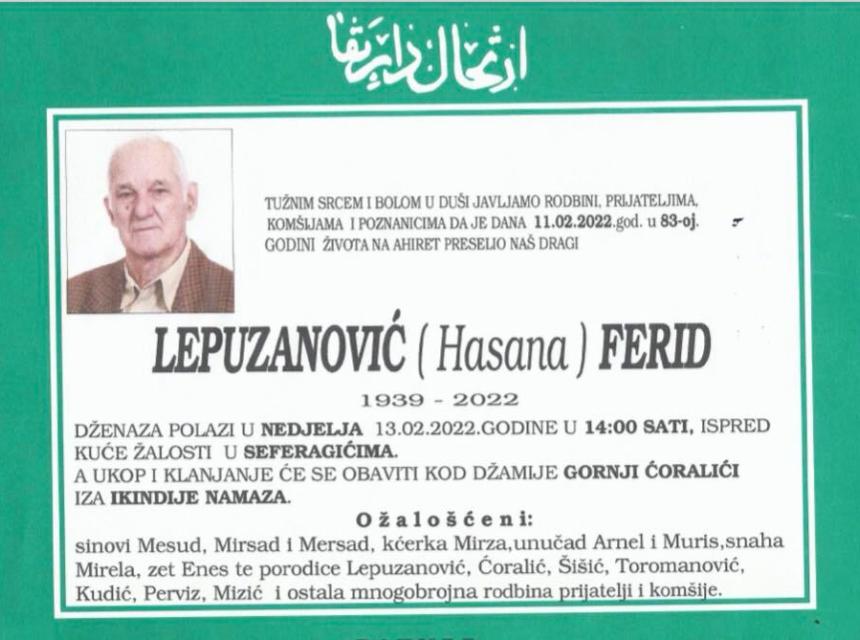 Tužnog srca i s bolom u duši obavještavamo rodbinu, komšije i prijatelje da je naš dragi Lepuzanović (Hasana) Ferid 11.02.2022. u 83. godini života preselio na Ahiret.
