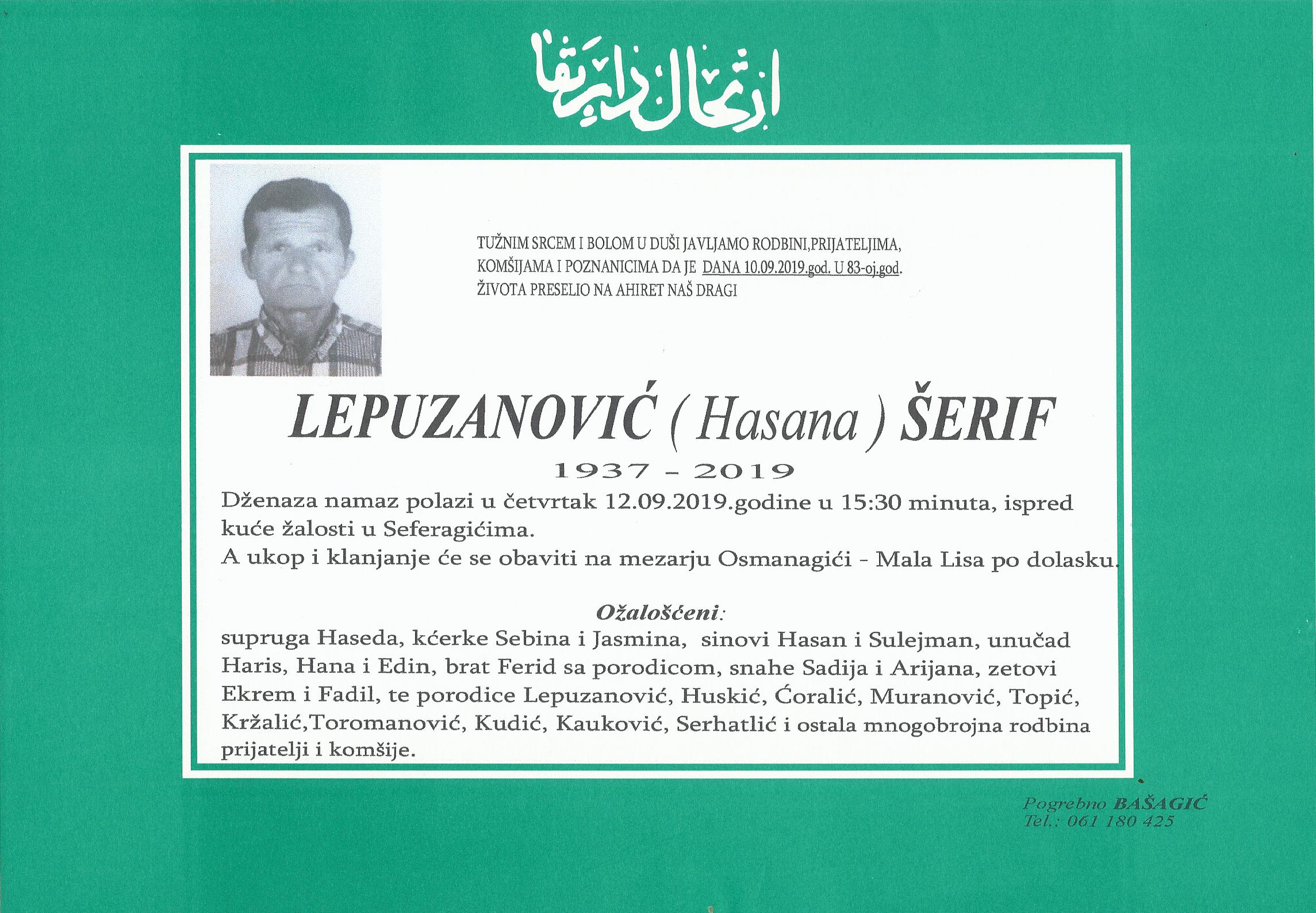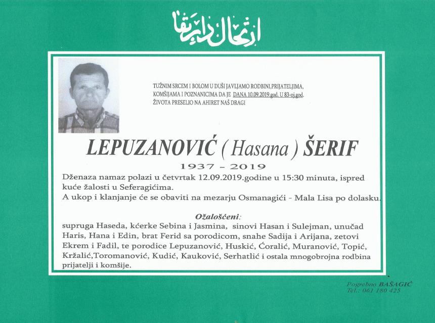 Tužnim srcem i bolom u duši, javljamo rodbini, prijateljima, komšijama i poznanicima da je dana 10.09.2019.god.u 83-oj. godini života preselio na Ahiret naš dragi Lepuzanović (Hasana) Šerif.