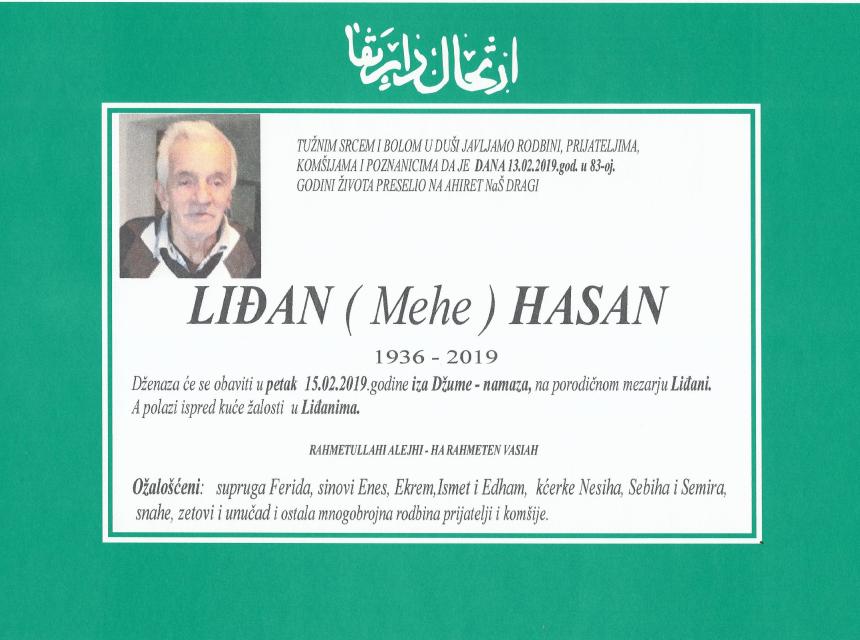 Tužnim srcem i bolom u duši javljamo rodbini, prijateljima i komšijama žalosnu vijest da je dana 13.02.2019.g. u 83.-oj godini života na Ahiret preselio Liđan (Mehe) Hasan.