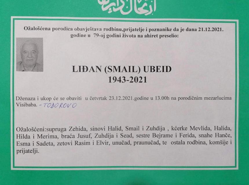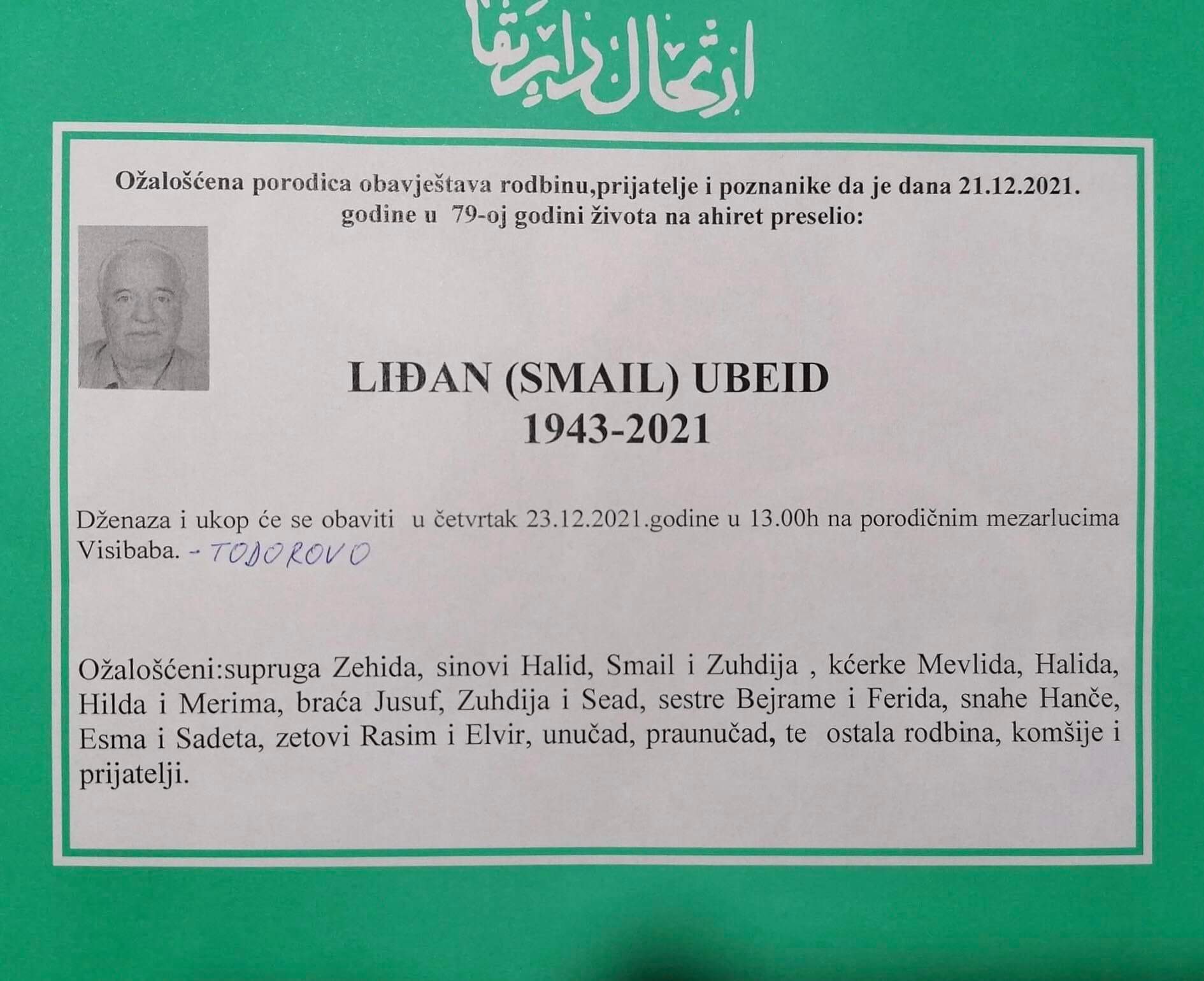 Tužnog srca i s bolom u duši obavještavamo rodbinu, komšije i prijatelje da je naš dragi Liđan (Smail) Ubeid dana 21.12.2021. u 79. godini života preselio na ahiret.