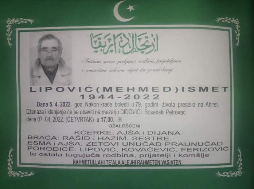 Tužnog srca i s bolom u duši obavještavamo rodbinu, komšije i prijatelje da je naš dragiLipović (Mehmed) Ismet u 79. godini života preselio na Ahiret.