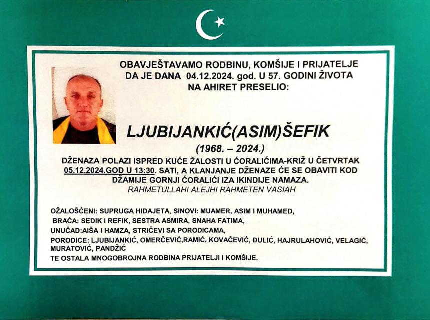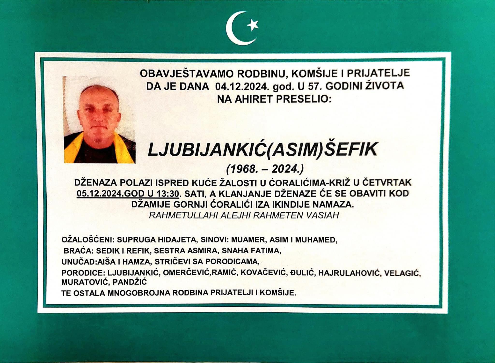 Tužnim srcem obavještavamo rodbinu, prijatelje i komšije da je naš dragi Ljubijankić (Asim) Šefik preselio na ahiret dana 04.12.2024. godine u 57-oj godini života.
