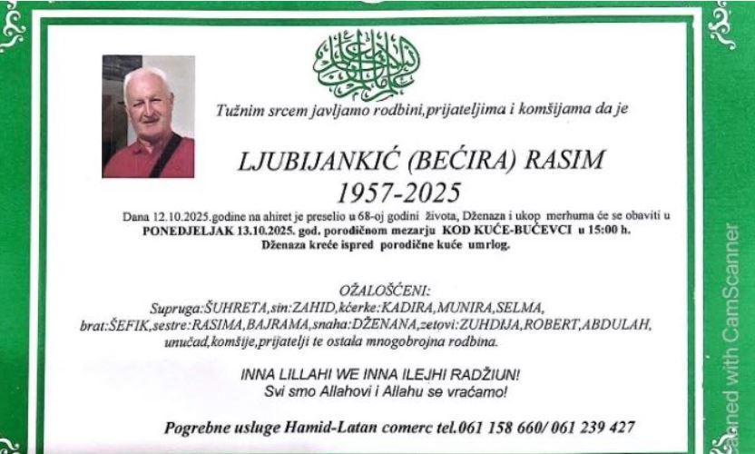 Tužnim srcem javljamo rodbini, prijateljima i komšijama da je LJUBIJANKIĆ (BEĆIRA) RASIM dana 12.10.2025. godine na ahiret je preselio u 68-oj godini života.